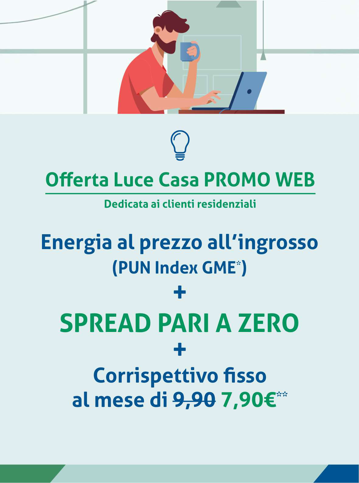 *Il prezzo si riferisce alla componente energia indicizzata al PUN Index GME più corrispettivo mensile fisso. Oltre alla componente energia e al corrispettivo mensile per la luce, le altre componenti fatturate al Cliente finale sono gli oneri di dispacciamento e generali e i corrispettivi per i servizi di rete, applicati e aggiornati secondo quanto previsto da ARERA e dal Distributore locale. È possibile consultare il valore dell’indice PUN Index GME sul sito del Gestore dei Mercati Energetici.